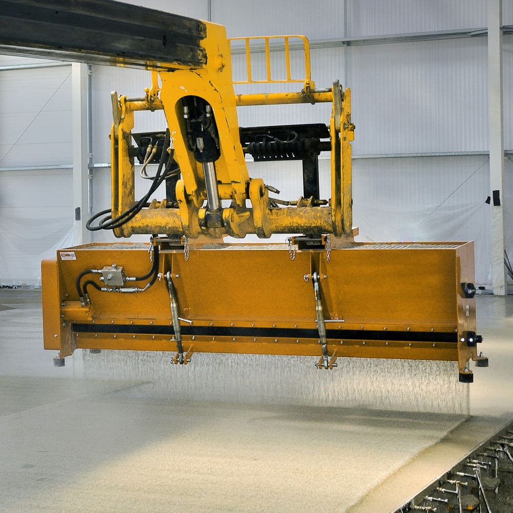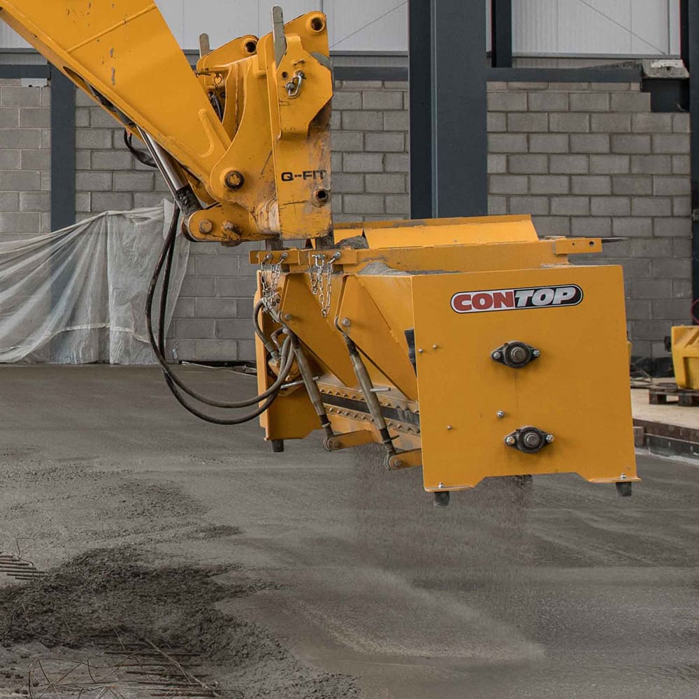 El esparcidor de cobertura Contop es un esparcidor de material seco versátil, montado en un manipulador telescópico, diseñado para esparcir material de manera eficiente.